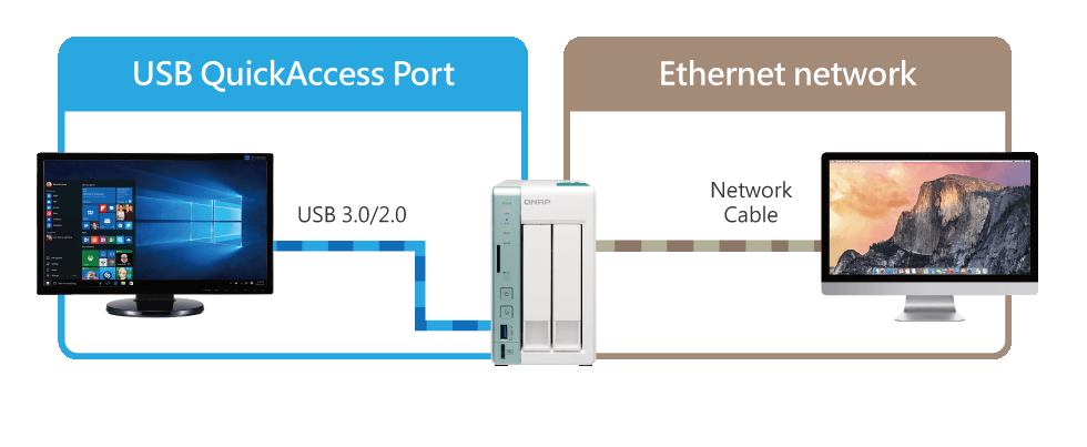 Подключите компьютер напрямую к USB-порту с опций QuickAccess и получите мгновенный доступ к данным внутри хранилища через утилиту Qfinder Pro. Для обеспечения безопасности существует три режима аутентификации, которые настраиваются в разделе интерфейса QTS «Сеть и виртуальный коммутатор»: