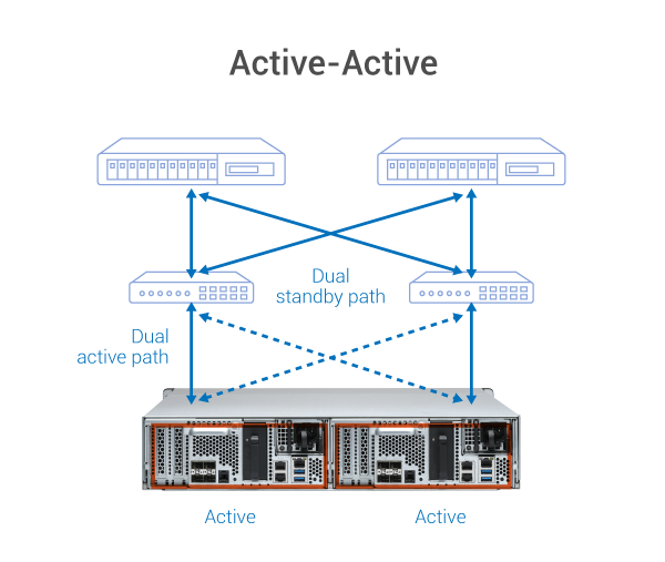 Отказоустойчивость системы хранения - приоритет для корпоративных клиентов. Именно поэтому ES2486dc оснащен двумя активными контроллерами с полным дублированием функционала при работе с дисковым массивом SAS. Такая реализация позволяет добится высокой отказоустойчивости для самых требовательных IT-систем. Для обеспечения высокой производительности и отказоустойчивости программно-аппаратный комплекс ES2486dc получил следующую архитектуру: