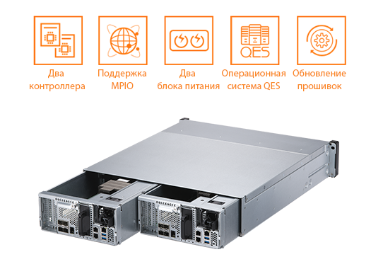 Два полностью идентичных контроллера ES2486dc и особенности конструкции корпуса позволяют выполнить горячую замену отдельных узлов: блока питания, батарейного модуля, блока вентиляторов или целого контроллера. При этом активный контроллер перехватит всю рабочую нагрузку, включая сетевые настройки портов обслуживаемого контроллера в считанные секунды. Новые алгоритмы, оптимизирующие и улучшающие рабочие показатели NAS внедряются в обновления прошивки. Приобретая устройство сегодня - вы можете быть уверены, что функционал системы хранения будет соответствовать вашим изменениям IT-инфраструктуры долгое время.