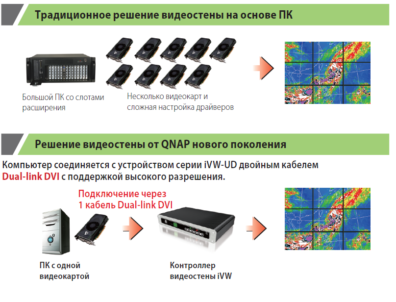 Компьютер соединяется с контроллером видеостены обычным кабелем DVI. Больше никаких настроек не потребуется, контроллер видеостены автоматически установит нужные параметры. В традиционных решениях требуется сложная настройка драйверов устройств и неочевидные процедуры конфигурирования. В контроллерах видеостены от QNAP все сводится к принципу «подключай и используй».