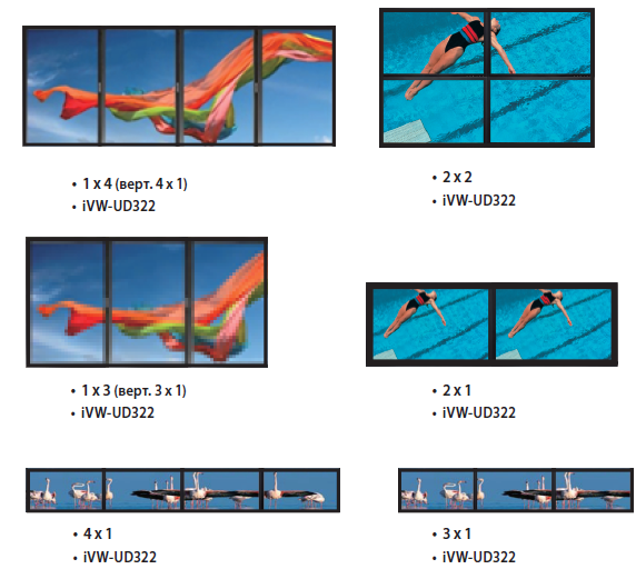 Программное обеспечение iSignager поддерживает работу с многоэкранными макетами. Таким образом, с его помощью можно создавать макеты для использования видеостен. У пользователей имеется возможность создавать единую зону для отображения мультимедийной информации, построчную компоновку или даже компоновку в виде независимых участков.