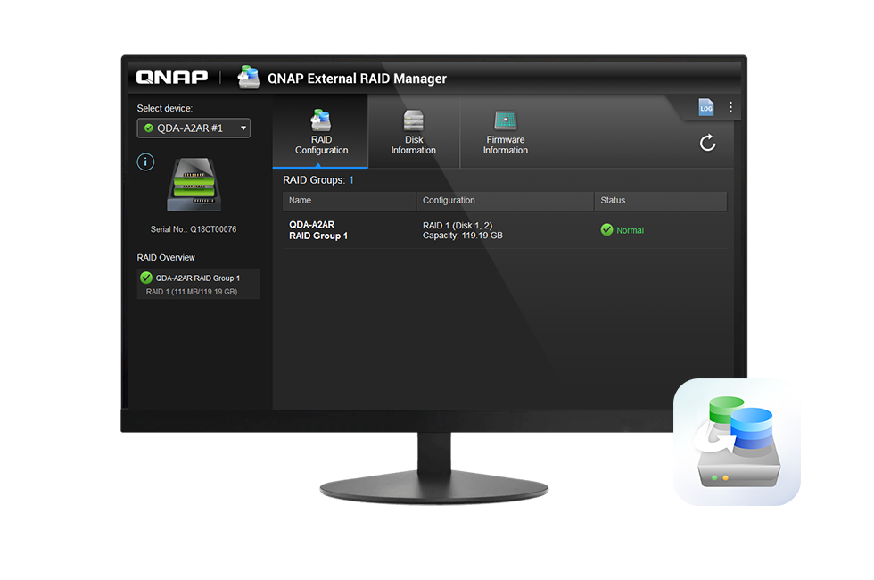 Утилита QNAP External RAID Manager предоставляет пользователям Windows® информацию о состоянии дисков и группы RAID в адаптере QDA-A2MAR. Также с ее помощью можно обновлять прошивку адаптера.