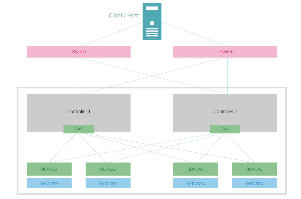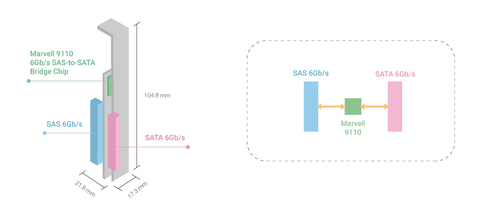 Двухканальный интерфейс SAS служит для организации дискового пространства без единой точки отказа для более высокой надежности и производительности. Хотя твердотельные накопители SATA 6 Гбит/с обеспечивают высокопроизводительное и доступное дисковое пространство, одноканальный SATA интерфейс делает их непригодными для двухконтроллерных устройств. QDA-SA2 решает эту проблему и теперь вы можете использовать SATA SSD в двухконтроллерных СХД QNAP или серверах, чтобы совместить преимущества SAS для обеспечения отказоустойчивой корпоративной среды хранения данных с высокой доступностью SATA.