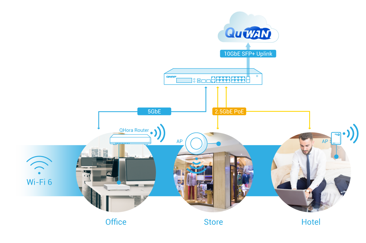 Восемь PoE-портов 2,5 Гбит/с, четыре из которых обеспечивают возможность подключения устройств с электропотреблением до 90 Вт, удовлетворят потребности современных точек доступа Wi-Fi 6. Благодаря разнообразным высокоскоростным сетевым интерфейсам QGD-1602P представляет собой комплексное решение для развертывания беспроводной сетевой инфраструктуры Wi-Fi 6 на предприятиях малого и среднего бизнеса, таких как гостиницы и магазины.