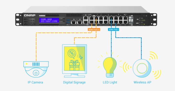 QGD-1602P соответствует стандартам IEEE 802.3bt PoE ++ и IEEE 802.3at PoE+, имеет четыре порта мощностью 90 Вт, четыре порта мощностью 30 Вт скоростью 2,5 Гбит/c и восемь портов мощностью 30 Вт скоростью 1 Гбит/c. Общий бюджет PoE может достигать 200/380 Вт подходит для разнообразных специфических камер: пуленепробиваемых, типа «рыбий глаз», высокого разрешения 4K с PTZ-управлением, скоростных купольных; и других устройств с энергопитанием по сети, таких как IP-телефоны, светодиодные фонари и цифровые вывески. QGD-1602P поддерживает интеллектуальные функции управления PoE: включение/выключение, планирование, приоритизацию источника питания. В режиме реального времени доступна информация о состоянии сетевого подключения и потребляемой мощности, а также настройка питаемых устройств (PD), позволяющая создать энергосберегающую PoE-сеть.