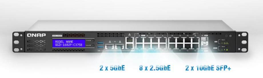 QGD-1602P оснащен многоядерным процессором Intel® Atom® C3000 с тактовой частотой 2,2 ГГц, двумя 2,5-дюймовыми отсеками для дисков SATA и двумя слотами для твердотельных накопителей M.2 NVMe (оптимальны для создания кэша), чтобы обеспечить высокую производительность операций ввода-вывода. Два слота PCIe Gen3 x4 предназначены под дополнительные карты расширения: сетевые адаптеры 10 Гбит/c, карты QM2 со слотами M.2 SSD и портами 10 Гбит/c, карты USB 3.2 Gen 2 (10 Гбит/с) и Wi-Fi адаптеры. Также для повышения производительности IPsec VPN поддерживается технология Intel® QuickAssist (Intel® QAT).