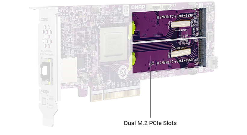 QM2-2P410G1T— это PCIe-карта расширения с двумя слотами M.2 SSD и портом 10 Гбит/c для увеличения производительности доступа к данным сетевого накопителя QNAP, персонального компьютера или рабочей станции. Слоты M.2 предназначены для установки SSD-дисков, которые повышают производительность доступа к данным без ущерба общему объему хранилища, поскольку они не занимают дисковые отсеки 3,5”. При этом повышается сетевая скорость благодаря порту 10 Гбит/c без необходимости в модернизации кабельной сети.