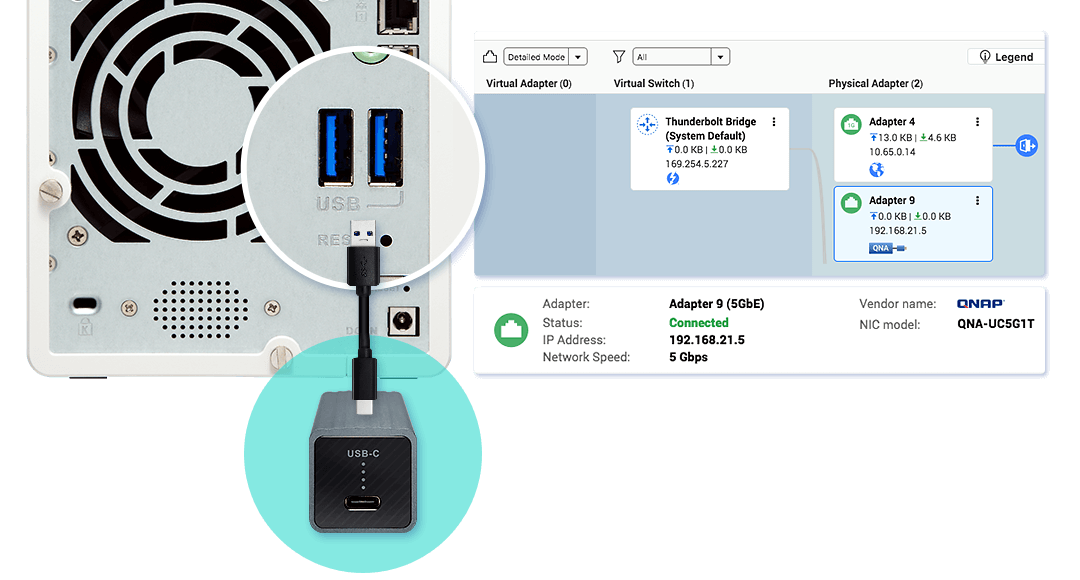 Внешний сетевой адаптер QNA-UC5G1T обеспечивает быстрый и простой способ повышения производительности по сети вашего QNAP NAS. Вы можете подключить несколько адаптеров QNA-UC5G1T к вашему NAS и управлять ими вместе с другими сетевыми портами в приложении Network & Virtual Switch.