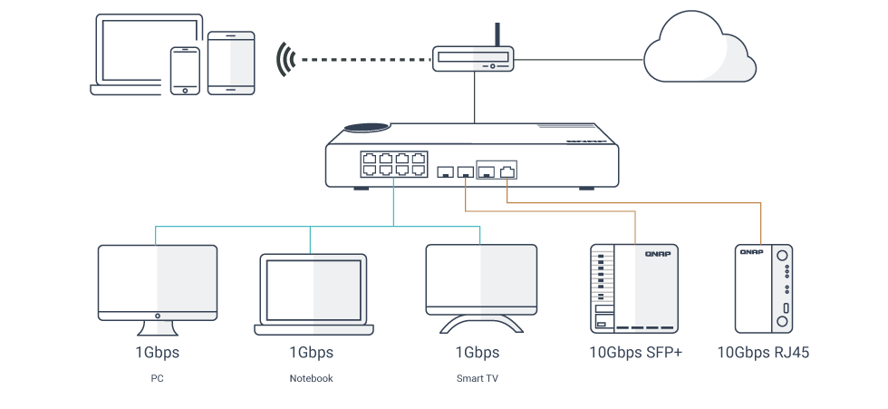 QNAP предлагает широкий спектр сетевых устройств, с помощью которых корпоративные и домашние пользователи могут построить инфраструктуру хранения и обмена данными через соединения на скорости 10 Гбит/с. Через адаптер-переходник от Thunderbolt 3 к 10GbE можно подключить компьютеры, ноутбуки и другие устройства без встроенных сетевых портов.