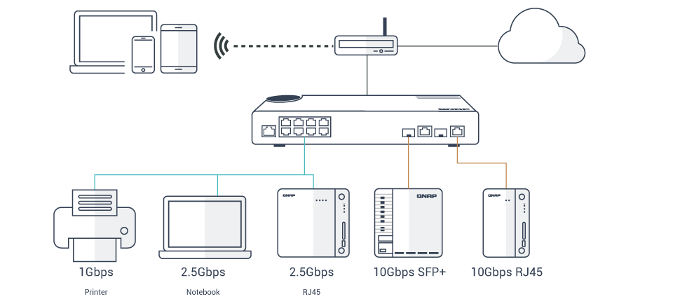 QSW-M2108-2C имеет коммутационную пропускную способность 80 Гбит/c. К нему можно подключить сетевые накопители на скорости 10 Гбит/c и разнообразные устройства через порты 2,5 Гбит/c, чтобы раскрыть потенциал высокоскоростного подключения к NAS при совместной работе нескольких пользователей.