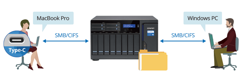 При помощи карт расширения Thunderbolt™ 3 совместная работа пользователей Final Cut Pro® и Adobe Premiere Pro® становится удобней и проще. Благодаря поддержке протокола SMB пользователи Final Cut Pro® могут работать с библиотекой на сетевом накопителе как будто это локальное запоминающее устройство. Каждый участник команды может хранить и редактировать видеофайлы в общих папках на NAS, что значительно повышает производительность совместных проектов при использовании нескольких рабочих станций.