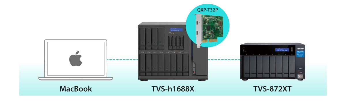 NAS с картой расширения Thunderbolt™ 3 может последовательно подключаться к другим сетевым накопителям QNAP со встроенными или опциональными портами Thunderbolt™, а также через адаптеры Thunderbolt 3 - 10GbE (серия QNA). Таким образом можно соединить по цепочке до 6 устройств.