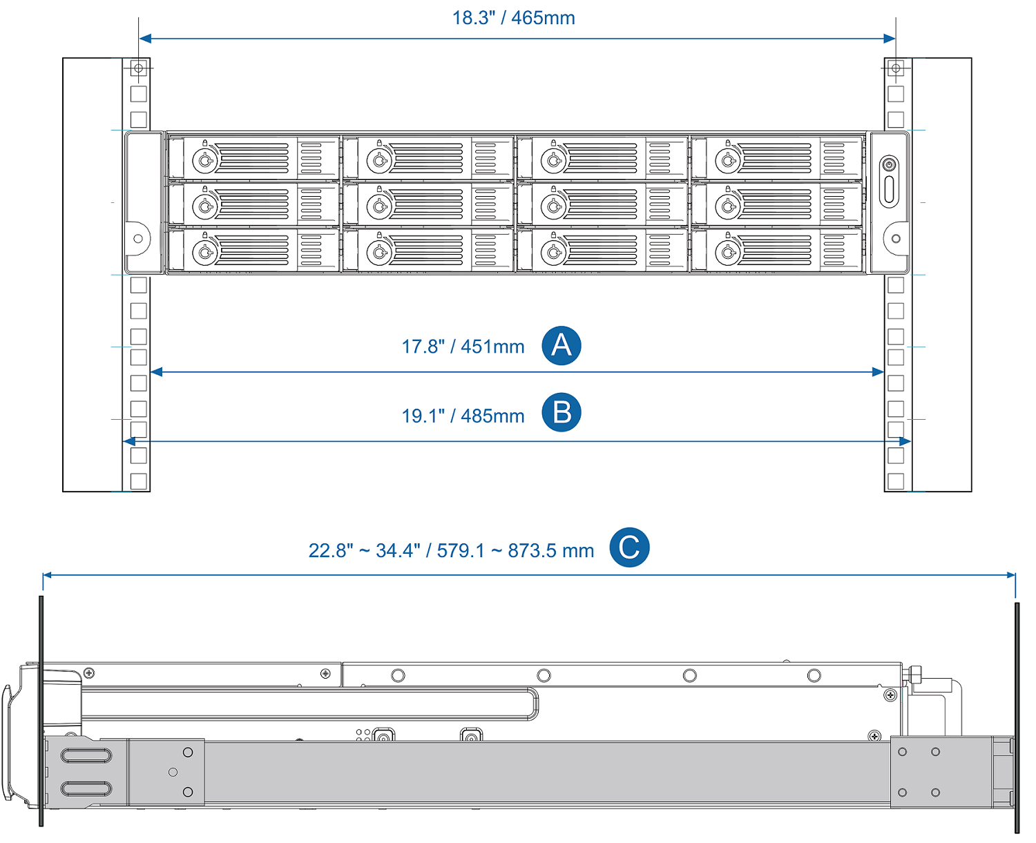 - A. Ширина монтажной стойки: ≥ 17.8" / 451 мм