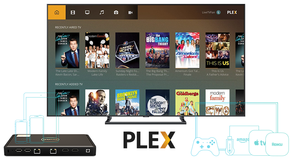 Установите Plex® Media Server из Центра приложений, чтобы выполнять потоковую передачу хранящихся медиафайлов на мобильные устройства и устройства потоковой передачи мультимедиа (включая DLNA®, Roku®, Amazon Fire TV® и Google Chromecast™).