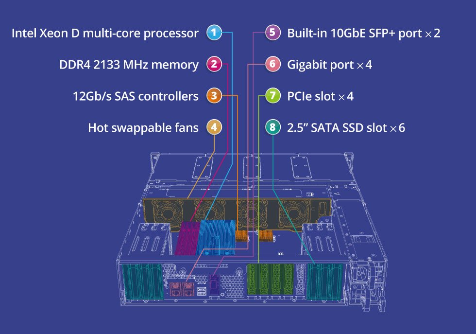 Накопитель TES-1885U, оснащенный 64-битным SoC процессором Intel Xeon D-1531 6-core 2,2 ГГц с интегрированной PCH платформой, поддерживает до 128 ГБ оперативной памяти DDR4 ECC RDIMM, имеет два встроенных порта 10 Гигабит SFP+ и 12 Гб/с SAS-контроллер. Линейка отличается превосходной производительностью в работе с данными, как в процессе передачи их по сети, так и в приложениях. Благодаря рассеиваемой мощности блока питания в диапазоне 20-65 Вт, накопитель, ко всем прочему, позволяет снизить затраты на электроэнергию.