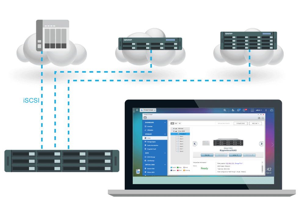 *Удаленный QNAP NAS должен поддерживать iSCSI, пулы хранения и использовать QTS 4.2.1 (или выше). Можно смонтировать максимум до 8 удалённых накопителей.
