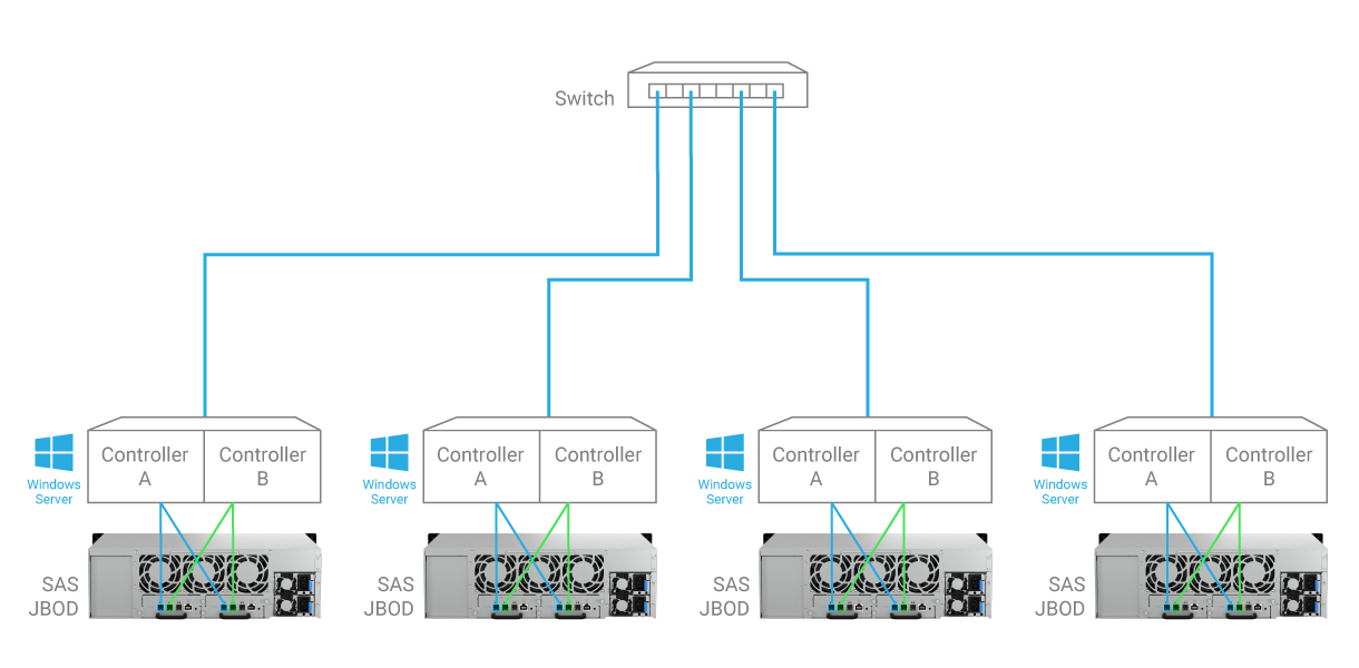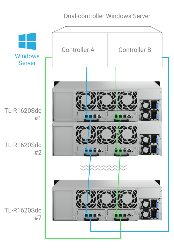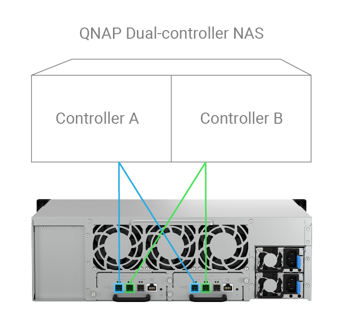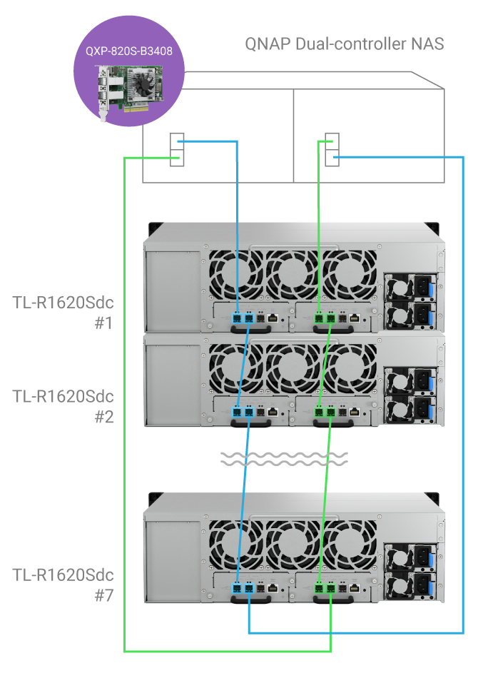 Возможность перекрестного подключения к двум контроллерам методом обратной петли исключает единую точки отказа как в самих модулях расширения, так и в соединительных кабелях. Это сохраняет доступ к дисковому пространству модуля расширения со стороны головного NAS-устройства в рамках системы хранения данных.