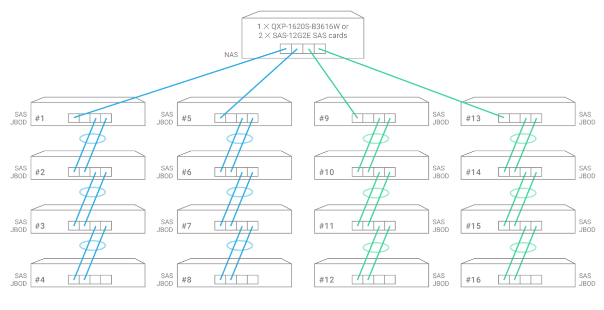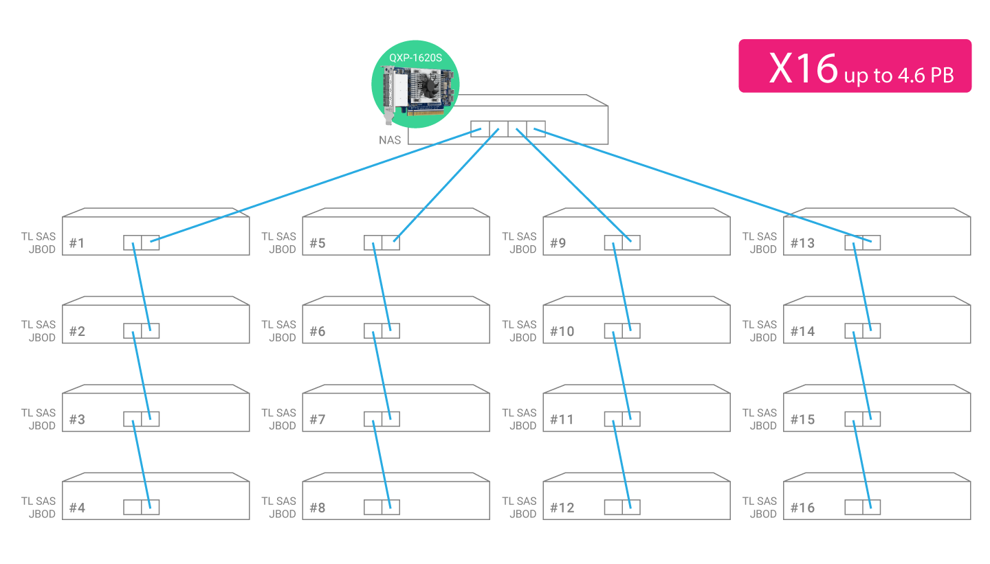 TL-R1620Sep-RP имеет четыре порта SAS 3.0 12 Гбит/с (x4 канала) SFF-8644. Подключите в каждый из четырех каналов по четыре последовательно соединенных модуля и получите максимально возможную общую емкость до 4,6 ПБ.