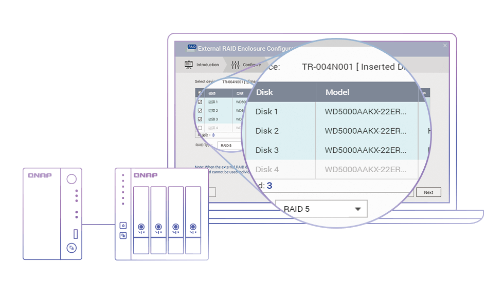 Устройство расширения TR-004 поддерживает несколько типов конфигурации RAID. В зависимости от задач вы можете самостоятельно выбрать режим эксплуатации между аппаратным и программно-управляемым RAID. С помощью переключателя DIP, расположенного на тыловой части корпуса вы можете выбрать режимы Individual, JBOD, RAID 0, RAID 1/10 или RAID 5. Также можно сконфигурировать RAID с NAS QNAP или компьютера, используя утилиту External RAID Manager.