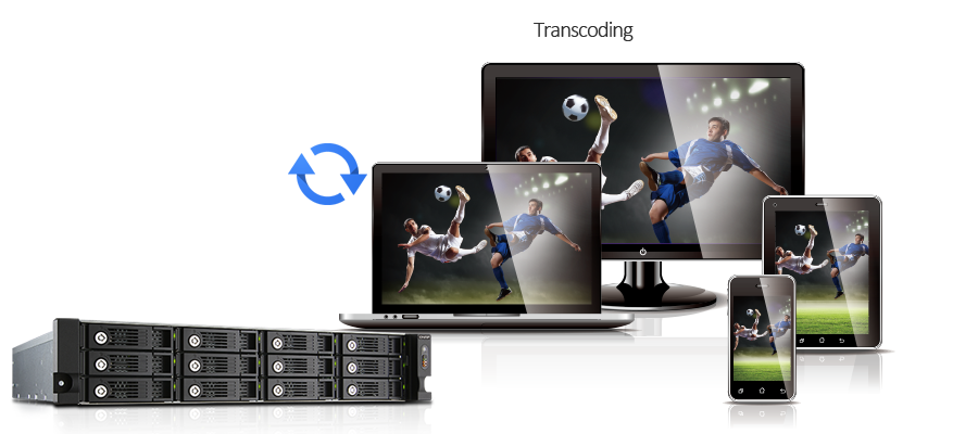Благодаря аппаратной подсистеме транскодирования TS-1253U-RP обеспечивает идеальное преобразование видео высокой четкости (Full HD, 1080p) в режиме реального времени, конвертируя видео из общих в универсальные форматы, которые легко воспроизводятся на персональных компьютерах, мобильных устройствах и телевизорах с поддержкой Smart TV. TS-1253U-RP позволяет мгновенно просматривать видео на нескольких устройствах – в том числе на тех, которым не хватает вычислительной мощности, и тех, которые поддерживают ограниченный набор форматов, не прибегая к помощи сложных и отнимающих массу времени процедур конвертации.