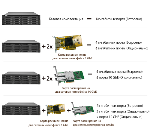 Пропускную способность штатных сетевых интерфейсов можно увеличить при помощи установки дополнительных сетевых карт 10 GbE или 1 GbE.