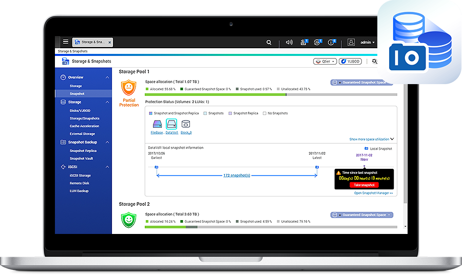 Менеджер хранения QTS имеет в арсенале простой инструмент для создания мгновенных снимков и восстановления данных в любой момент времени, чтобы максимально снизить вероятность потери важных данных размещенных на накопителе. Вы можете делать снимки Volume/LUN’ов (до 256 снимков на том или LUN, максимум до 1024 снимков на NAS) и осуществлять репликацию Volume/LUN-снимков на удаленный сервер, копируя только изменения источника, либо быстро создать точную копию локального тома, выбрав из архива нужный снимок, без необходимости прерывания текущих операций системы. Опционально, можно настроить создание снимков по расписанию, до плановых операций через RTRR/rsync, даже если с файлами в данный момент работают.