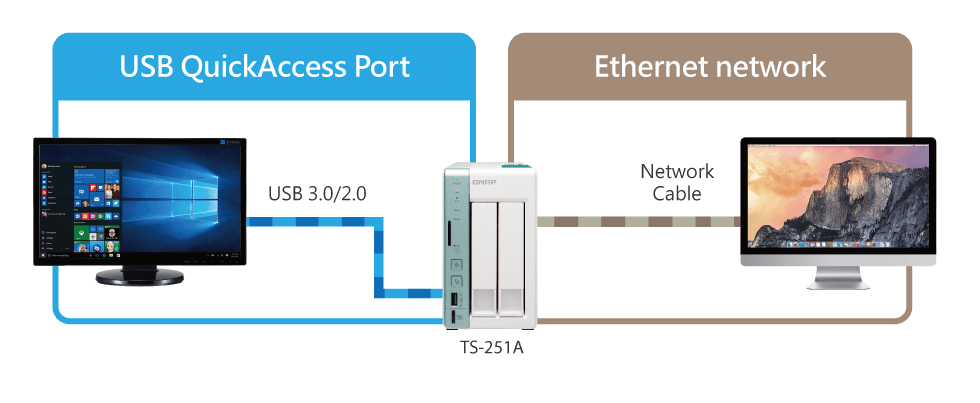 Накопитель TS-251A имеет на борту USB–порт с опцией QuickAccess для первоначальной настройки устройства и прямого доступа к хранящимся файлам, что дополняет традиционные методы с использованием сети.