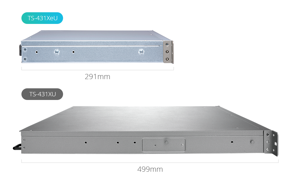 По сравнению с традиционным NAS с четырьмя дисковыми отсеками TS-431XeU имеет глубину всего 291 мм. TS-431XeU отличный выбором для малогабаритных шкафов, а в случае использования стандартных стоек пространство можно использовать для прокладки кабелей или вентиляции.