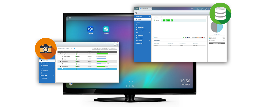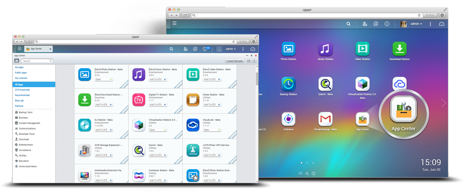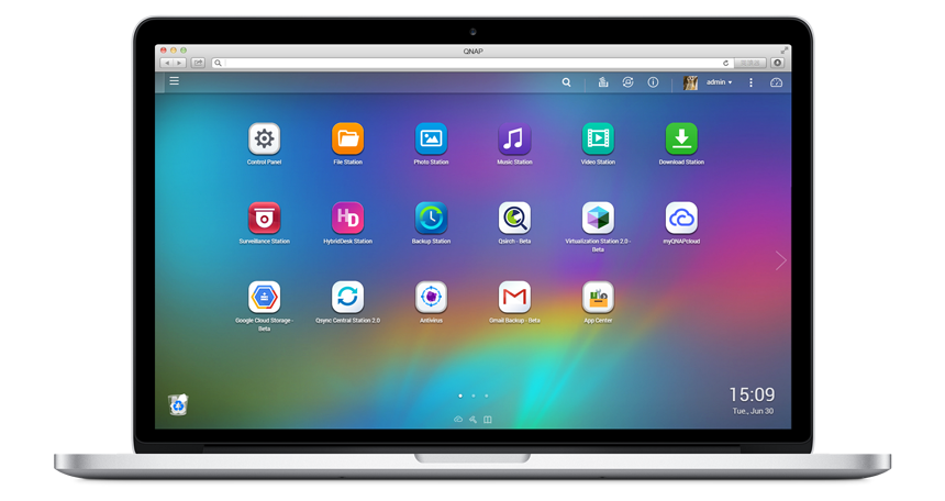 Операционная система QTS 4.2 отличается понятным интерфейсом, что делает работу с сетевым накопителем проще и быстрее. Вы с легкостью найдете нужные функции, сможете создать ярлыки часто используемых приложений, просматривать системную информацию в реальном времени. Поддержка мультизадачности позволяет одновременно открывать несколько окон, работая параллельно с различными приложениями. В веб-интерфейсе системы есть доступ к облачным сервисам и таким продвинутым функциям, как моментальные снимки дисковых томов, управление iSCSI, станция виртуализации и др.