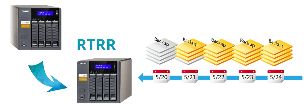 TS-453A предлагает различные варианты резервирования и восстановления данных. Служба RTRR (Real-Time Remote Replication) поддерживает резервное копирование данных в реальном времени или по расписанию с участием удаленного накопителя Turbo NAS или FTP-сервера. Также можно настроить синхронизацию файлов между локальной папкой и удаленной, что обеспечивает более высокую эффективность резервного копирования и сокращает время выполнения. Кроме того, TS-453A поддерживает протокол rsync для резервного копирования данных на удаленный сервер по расписанию. Дополнительно реализована возможность копировать данные в публичные облачные хранилища, такие как Amazon S3, ElephantDrive, Symform, Dropbox и Google Drive, после чего файлы можно в любое время восстановить из них на сетевой накопитель или другое ваше устройство.