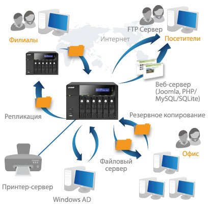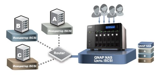 Хранилище может использоваться одновременно для предоставления общего доступа к ресурсам и в качестве клиента/сервера iSCSI. Благодаря встроенной функции «Виртуальный диск» (Virtual Disk Drive) можно легко увеличить емкость дискового пространства хранилища. Используя встроенный инициатор iSCSI, сетевой накопитель QNAP может подключаться к другим целевым устройствам iSCSI и превращать их в виртуальные диски (до 8 виртуальных дисков), которые становятся томами на хранилище. Накопитель при этом выступает в качестве мастера iSCSI: все, что нужно сделать пользователю, – просто  подключиться один раз к этому хранилищу.