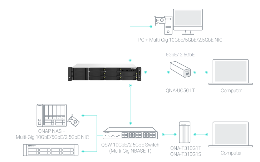 | NAS 2,5 Гбит/с | QNAP NAS оснащенные одним или несколькими портами 2,5 Гбит/с с возможностью объединения портов позволяет комбинировать несколько портов для увеличения пропускной способности. |