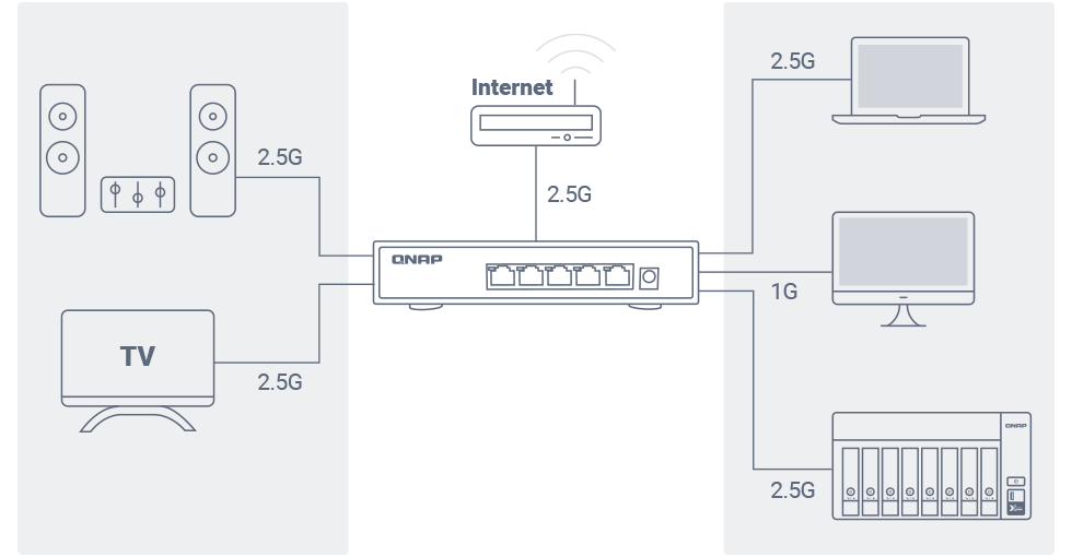 TS-473A оснащен двумя сетевыми портами 2,5 Гбит/c RJ45, к которым подключаются существующие кабели CAT5e, при этом скорость сети повышается с 1 Гбит/с до 2,5 Гбит/с. Порты также поддерживают транкинг для повышения скорости передачи данных до 5 Гбит/с. С помощью адаптера QNAP N-BASET / Multi-Gig USB 3.2 Gen 1 - 5 GbE или карт расширения PCIe 5 GbE можно подключить ноутбук или настольный компьютер к сетям 2,5 Гбит/c совместно с TS-473A.