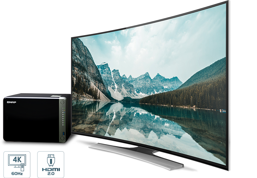 TS-653D оснащен портом HDMI 2.0, который поддерживает вывод изображения с разрешением до 4K (4096 x 2160) и частотой 60 Гц, чтобы напрямую просматривать мультимедийный контент, хранящийся на сетевом накопителе. Поддержка высококачественного транскодирования видео 4K помогает преобразовывать видео в универсальные форматы файлов, которые можно корректно воспроизводить на нескольких устройствах. TS-653D также может передавать видео через DLNA®, Chromecast и другим сетевым протоколам для расширения спектра возможностей воспроизведения.