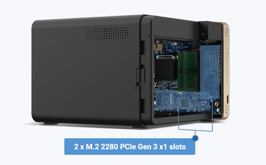 TS-664 имеет два слота M.2 PCIe, что позволяет использовать SSD-кэширование или пулы хранения SSD для повышения производительности или других приложений.