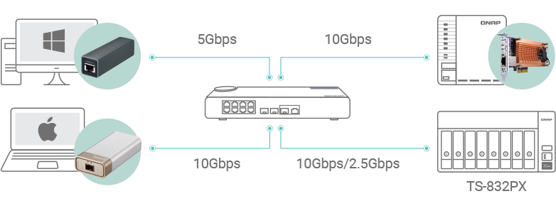 TS-832PX оснащен двумя сетевыми портами 2,5 Гбит/c RJ45, к которым подключаются существующие кабели CAT5e, при этом скорость сети повышается с 1 Гбит/с до 2,5 Гбит/с. Порты также поддерживают транкинг для повышения скорости передачи данных до 5 Гбит/с. С помощью адаптера QNAP N-BASET / Multi-Gig USB 3.2 Gen 1 - 5GbE (название модели QNA-UC5G1T) или карт расширения PCIe 5 GbE (название модели QXG-5G1T-111C) можно подключить ноутбук или настольный компьютер к сетям 2,5 Гбит/c совместно с TS-832PX. Так-же накопитель TS-832PX оснащен вдумя встроенными портами Gigabit Ethernet и двумя высокоскоростными сетевыми интерфейсами на 10 Гбит/с SFP+. Поддерживающая стандарт 10GbE, модель TS-832PX обеспечивает исключительно высокую пропускную способность. В сочетании с поддержкой высокой емкости хранилища накопитель TS-832PX идеально подходит для центров обработки данных благодаря умению работать с большими объемами данных и обеспечивать высочайшую скорость передачи данных, а также для редактирования видеофайлов большого размера "на лету", не пересылая их туда и обратно между накопителем TS-832PX и настольными компьютерами.