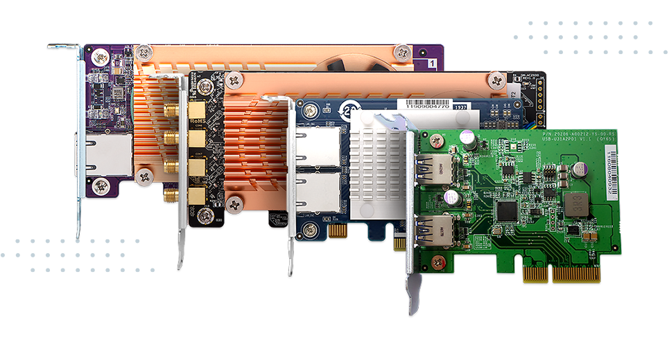 Слот PCIe Gen 2.0 x 2 расширяет возможности TS-853DU-RP. Чтобы повысить производительность, установите плату QNAP QM2 со слотами SSD M.2 SATA или NVMe и сетевым портом 10 Гбит/c для организации кэш-памяти или многоуровневого хранилища Qtier. Если необходимо прямое беспроводное подключение Wi-Fi к NAS, то установите модуль QNAP QWA-AC2600. Дополнительные высокоскоростные порты 5 или 10 Гбит/c добавит сетевая карта серии QXG.