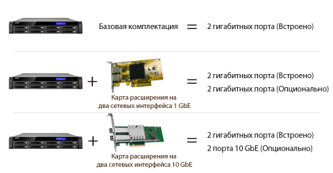 Пропускную способность штатных сетевых интерфейсов можно увеличить при помощи установки дополнительных сетевых карт 10 GbE или 1 GbE.
