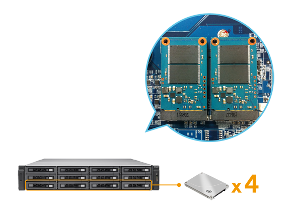 TS-EC1280U R2поддерживает два внутренних порта mSATA, и до 4 накопителей можно использовать для кэширования. Установив флеш-модули mSATA (приобретаются отдельно), можно значительно увеличить количество IOPS, что особенно актуально для приложений, требовательных к производительности системы хранения, таких как базы данных и виртуализация.