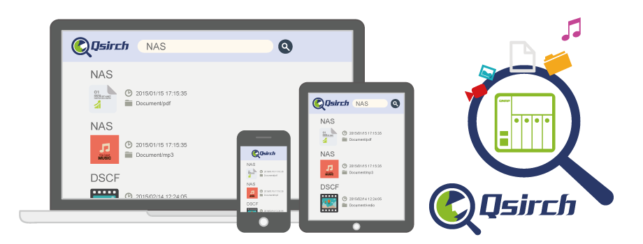 Благодаря Qsirch на QNAP NAS возможен полнотекстовый поиск конкретных файлов, в том числе документов, фильмов, песен и фотографий. С помощью алгоритма пользователи могут получить результаты во время ввода поискового запроса и легко определить файлы в списке совпадений по категории и с помощью предварительного просмотра. Поиск выполняется также по ключевым словам в содержимом файлов.