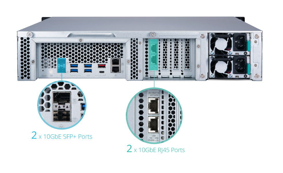 TS-h1277XU-RP готов к подключению в высокоскоростные сетевые среды 10 Gigabit Ethernet и имеет встроенный двухпортовый 10-гигабитный SFP+ PCI-адаптер, эффективно работающий как с медными, так и с оптическими трансиверами. Сочетание высокой пропускной способности и большой емкости делает этот NAS идеальным решением для центров обработки данных и сетей, где необходимо обрабатывать большие объемы данных и предоставлять к ним общий доступ “на лету”, решать задачи виртуализации, а также резервного копирования и восстановления.