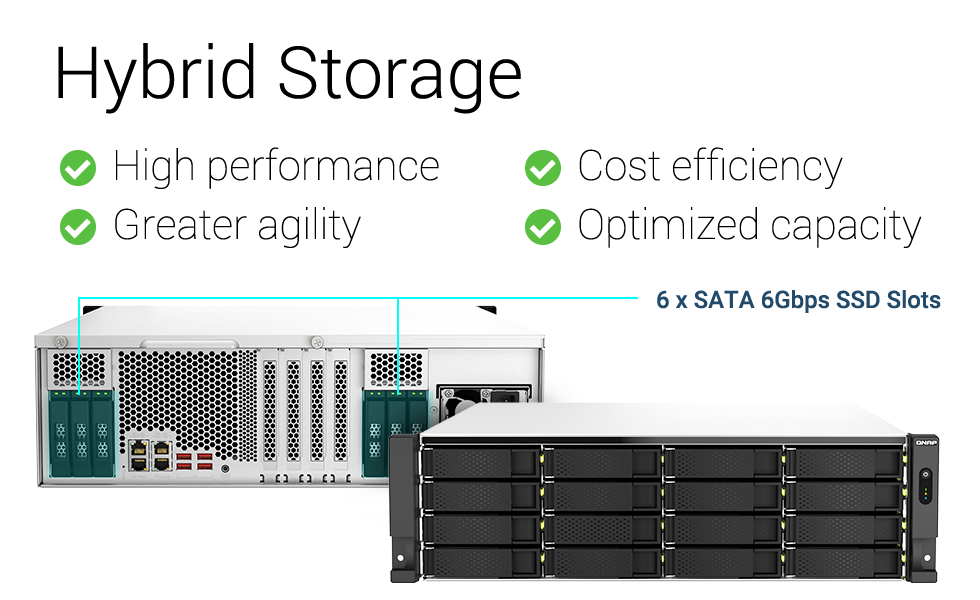 По сравнению с традиционными массивами хранения гибридный накопитель TS-h2287XU-RP обеспечивает оптимальный баланс между стоимостью, производительностью и емкостью дисковой подсистемы. Оснащенный шестнадцатью 3,5-дюймовыми отсеками SATA 6 Гбит/с для жестких дисков и шестью 2,5-дюймовыми слотами SATA 6 Гбит/с для твердотельных накопителей, TS-h2287XU-RP поддерживает кэширование на основе SSD для корректной работы приложений с высокими требованиями к операциям ввода-вывода.