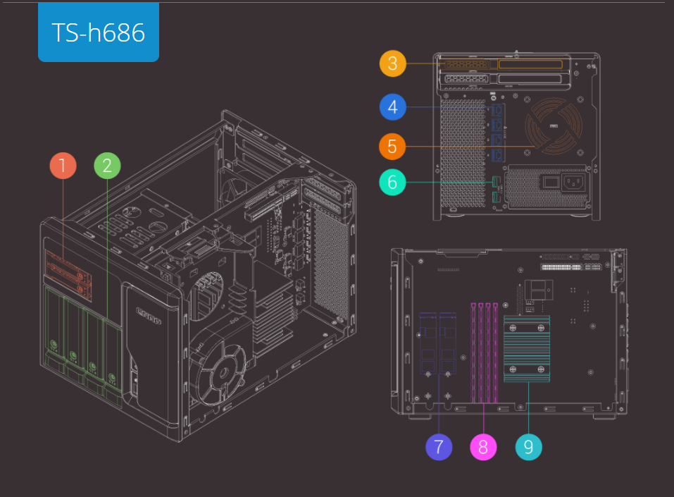 Компоновка TS-h686 реализует два SATA отсека для 2,5-дюймовых твердотельных накопителей и два слота M.2 NVMe Gen3 x4, которые позволяют гибко настраивать кэширование или использовать в качестве сверхбыстрого тома на SSD. Это особенно удобно при работе с базами данных и виртуализацией.