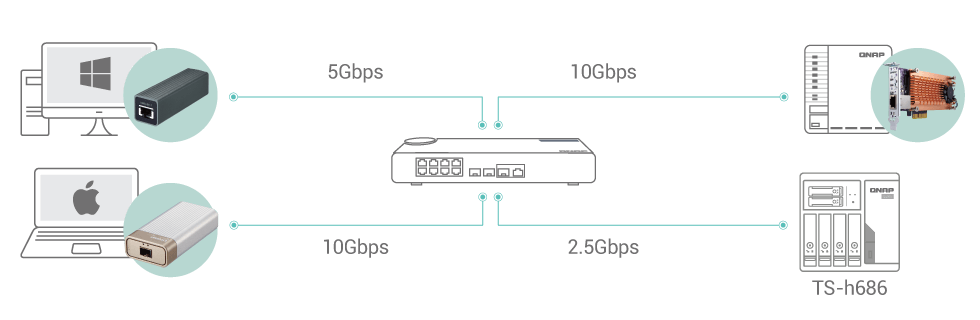 TS-h686 оснащен четырьмя сетевыми портами 2,5 Гбит/c RJ45, к которым подключаются существующие кабели CAT5e, при этом скорость сети повышается с 1 Гбит/с до 2,5 Гбит/с. Порты также поддерживают транкинг для повышения скорости передачи данных до 5 Гбит/с или 10 Гбит/с . С помощью адаптера QNAP N-BASET / Multi-Gig USB 3.2 Gen 1 - 5GbE (название модели QNA-UC5G1T) или карт расширения PCIe 5 GbE (название модели QXG-5G1T-111C) можно подключить ноутбук или настольный компьютер к сетям 2,5 Гбит/c совместно с TS-h686.