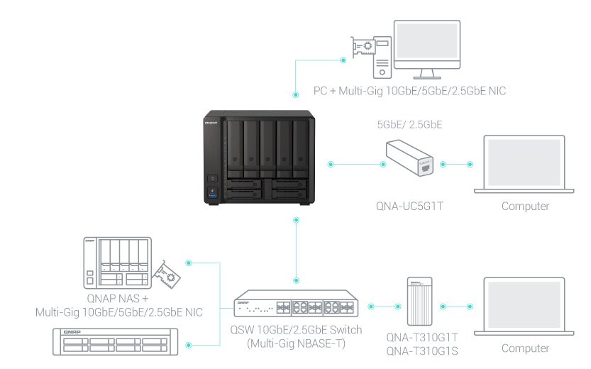 TS-h973AX оснащен двумя сетевыми портами 2,5 Гбит/с RJ-45, при подключении к которым кабелей CAT5e скорость обмена данными достигает 2,5 Гбит/с, а при включении транкинга повышается до 5 Гбит/с. С помощью адаптера QNA-UC5G1T или карты расширения QXG-5G1T-111C можно подключить ноутбук или настольный компьютер к сетям 2,5 Гбит/c через TS-h973AX.