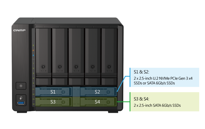 TS-h973AX оснащен четырьмя 2,5-дюймовыми отсеками для SSD, два из которых (с номерами 1 и 2) поддерживают высокопроизводительные твердотельные накопители U.2 NVMe PCIe Gen 3 x4 и обеспечивают пропускную способность до 32 Гбит/с, что востребовано для комфортной работы приложений, чувствительных к задержкам и требующих высоких значений IOPS.