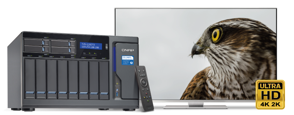 Модель TVS-1282T3 имеет на борту два 4K HDMI выхода и поддерживает режимы дублирования и расширения экранов. К устройству можно подключить телевизор, монитор или A/V-ресивер и с помощью сервиса HD Station просматривать видео, слушать музыку и онлайн-радиостанции, а также просто серфить в сети Интернет. Для управления приложениями HD Station устройство комплектуется инфракрасным пультом управления с функцией обучения, что позволяет легко запрограммировать часто используемые кнопки пульта телевизора и стерео системы. Обладатели Android и iOS смартфонов могут также осуществлять управление через мобильное приложение Qremote.