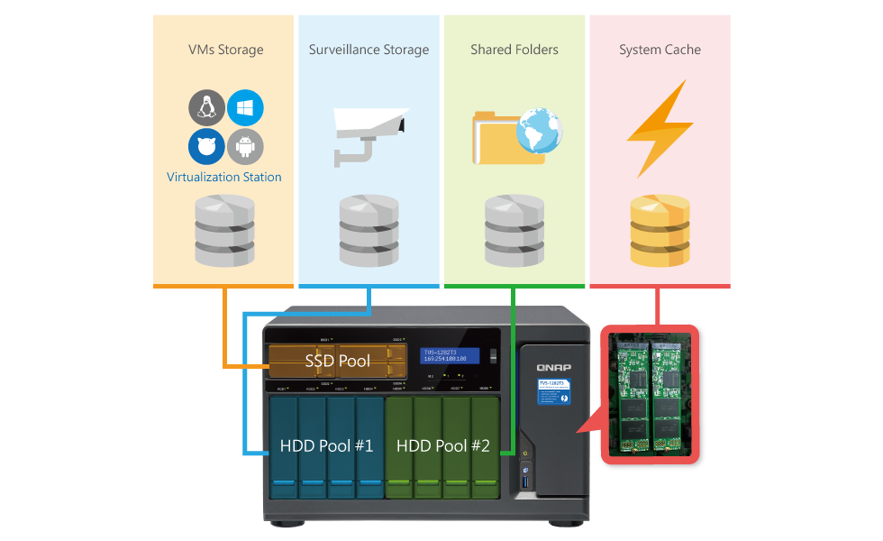 Фирменная технология автоматического тиринга Qtier позволяет TVS-1282T3 отслеживать все операции и оптимизировать хранение данных между внутренними M.2 SSD, SSD и SATA дисками. Так, наиболее запрашиваемые «горячие» данные помещаются на самые скоростные SSD-накопители, в то время как менее востребованная информация отправляется на диски с большей емкостью, что делает TVS-1282T3 невероятно эффективной СХД по соотношению производительности и стоимости владения.
