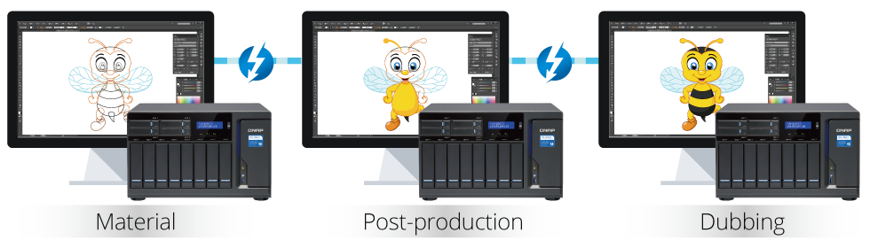 Студии видеопроизводства часто используют несколько серверов для увеличения производительности на различных этапах рабочего цикла, таких как захват видео, редактирование, производство, монтаж и наложение звука. В такой ситуации можно последовательно подключить до шести TVS-1282T3 к основному накопителю и назначить каждому конкретную задачу, в то время как рабочие станции будут использовать свободные порты Thunderbolt 2 для быстрого доступа к видеоданным.
