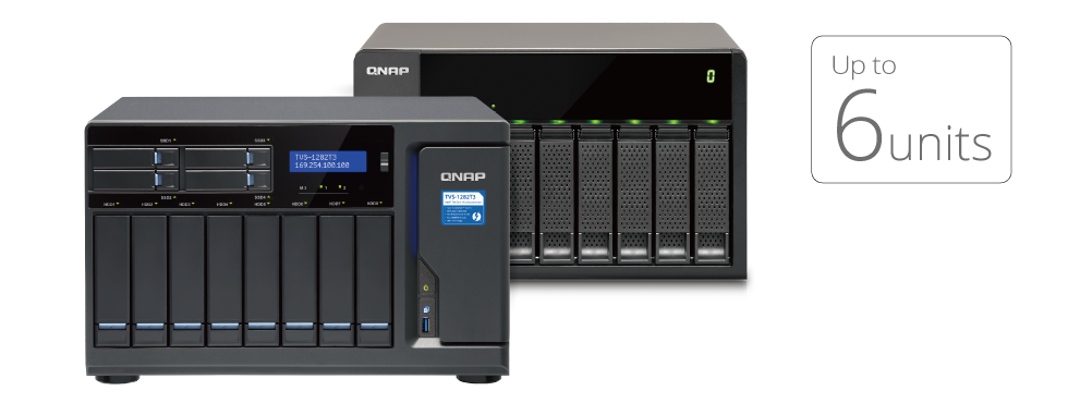 Накопитель TVS-1282T3 поддерживает увеличение дисковой емкости за счет внешних модулей. Можно подключить до 6 полок расширения TX-500P или TX-800P через порты .